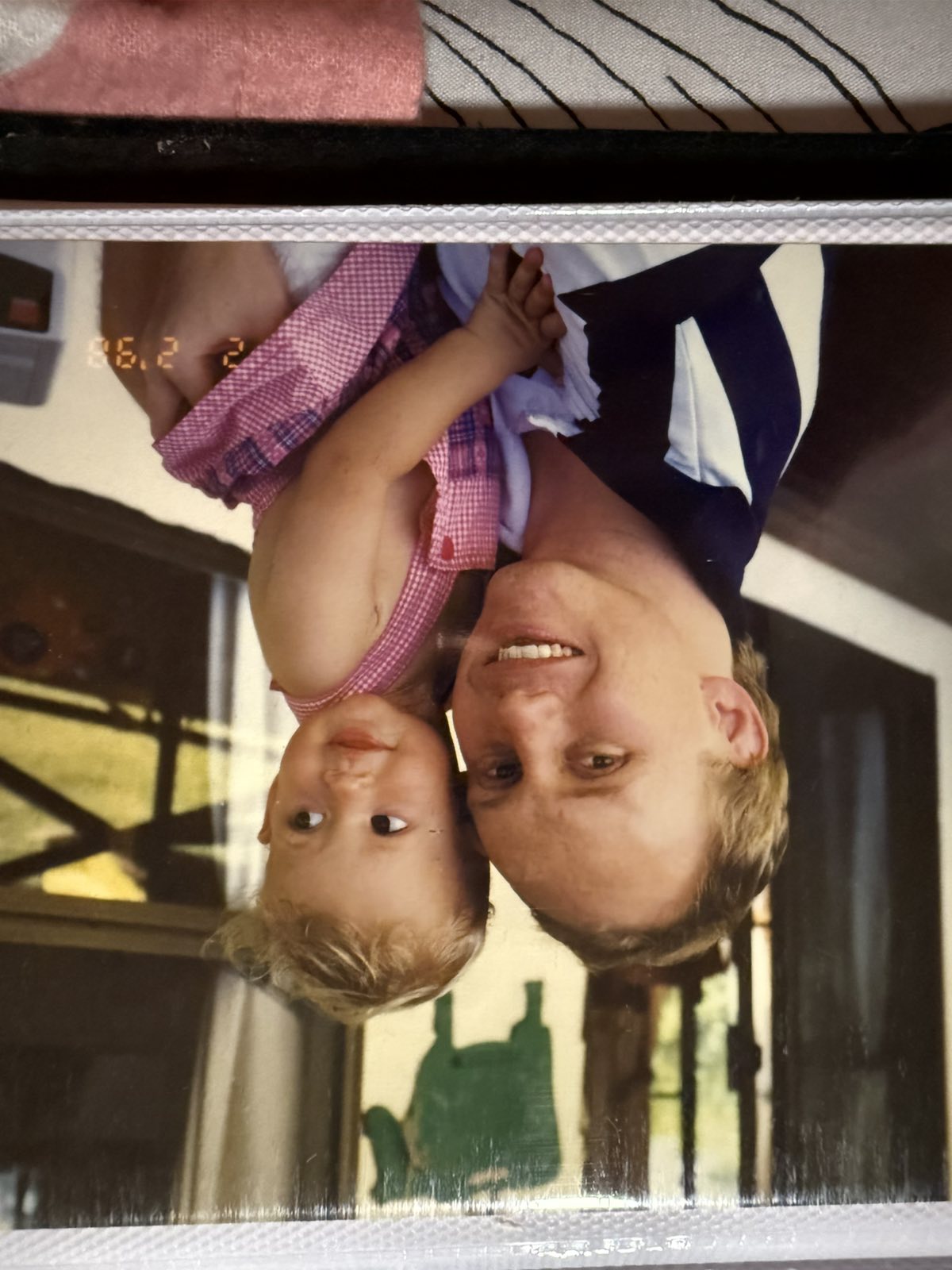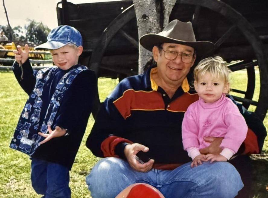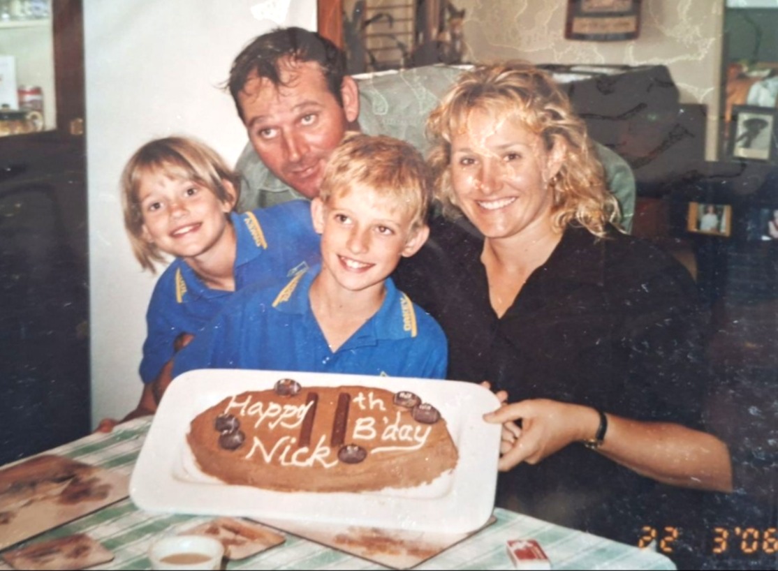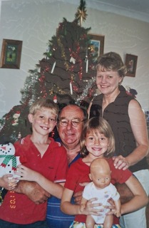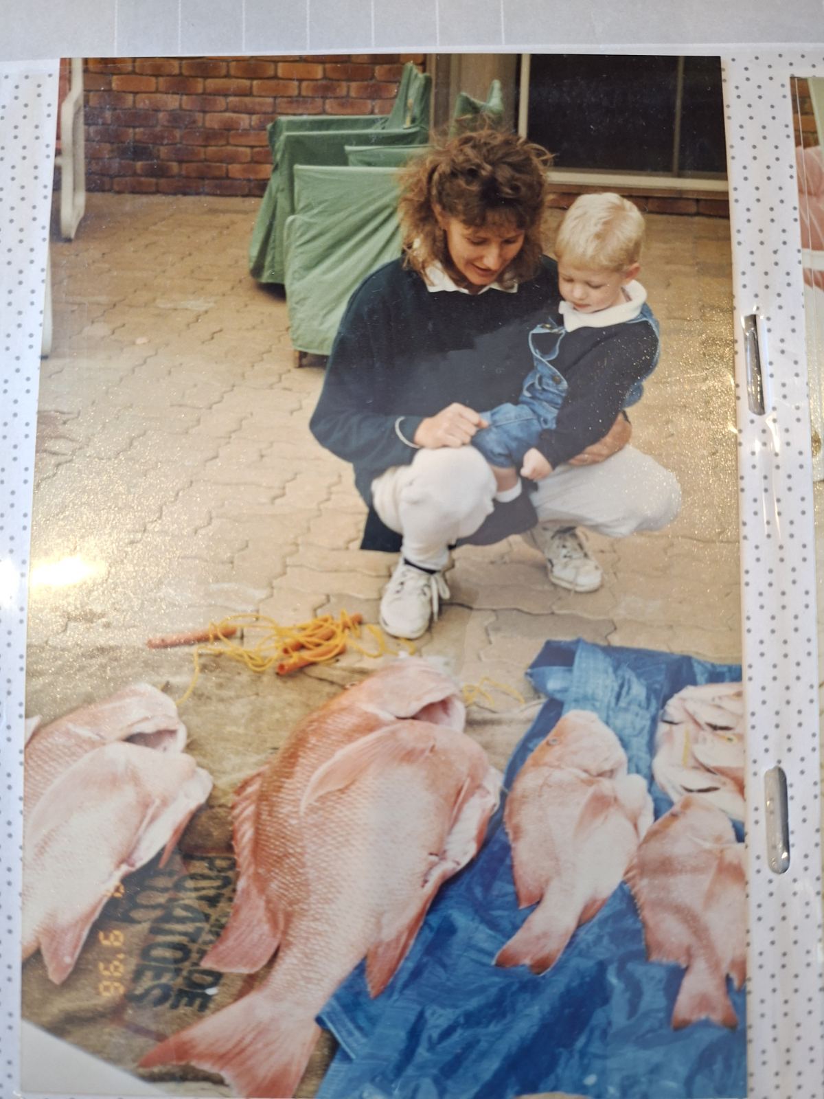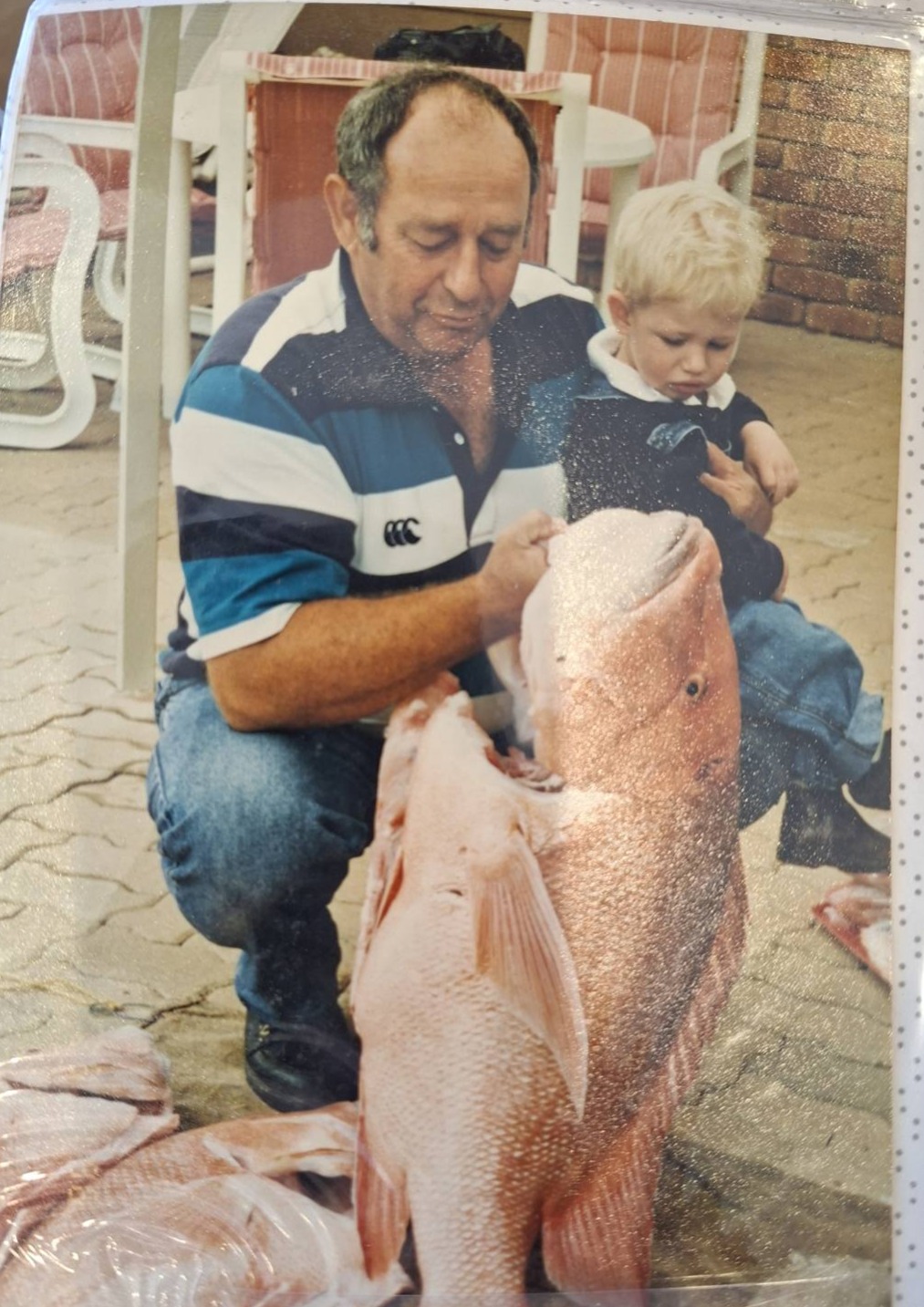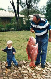 Pa holding a 22kg red emperor and a frightened Nicholas