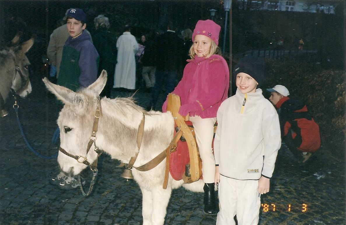 Jess, Nick and donkey used in Christmas Eve parade at Wengen in Switzerland