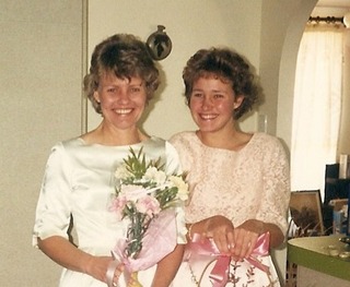 Marg in wedding dress with Sue in Bev's bridesmaid's dress at 25th wedding celebrations at Joneses
