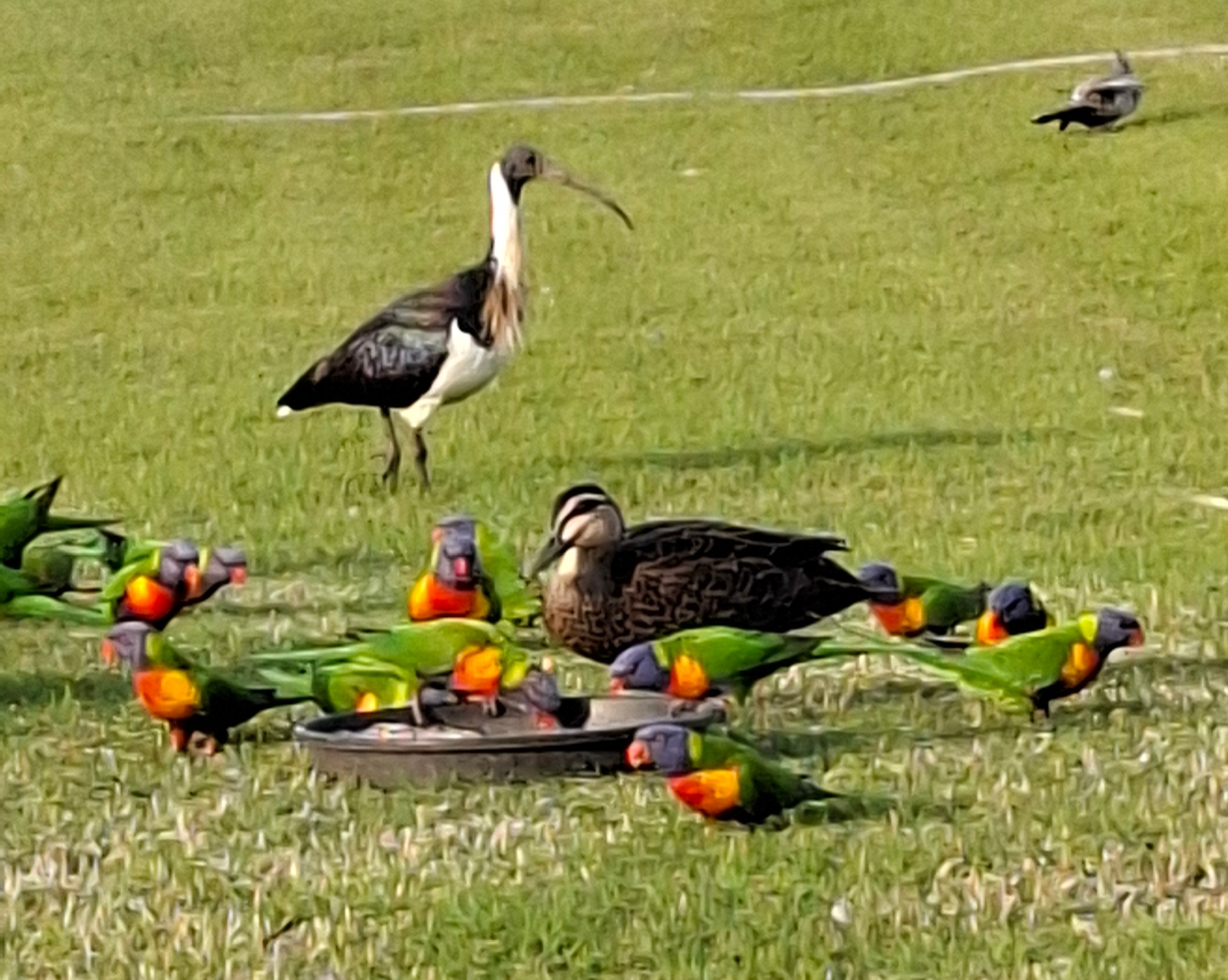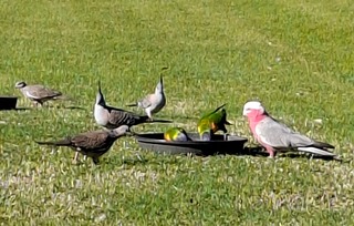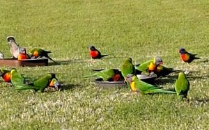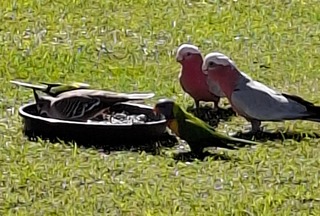 Lorikeets,crested pigeons and a galah share the trays