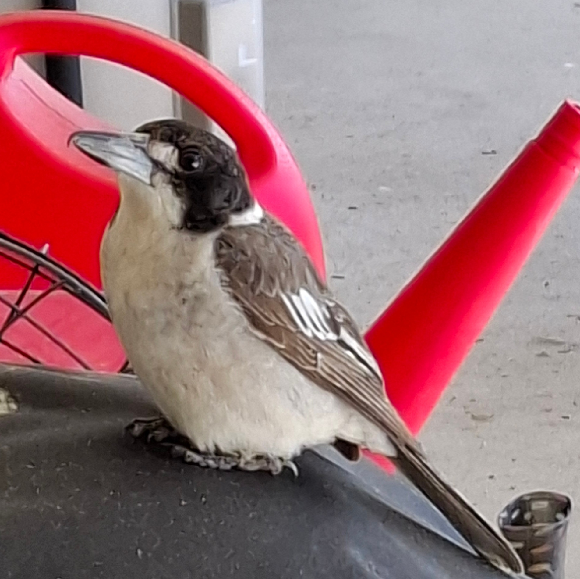 This butcher bird comes in close to the house to collect his portion of food |