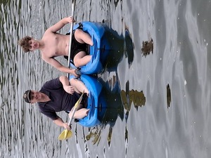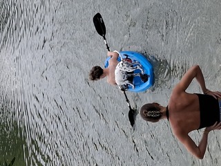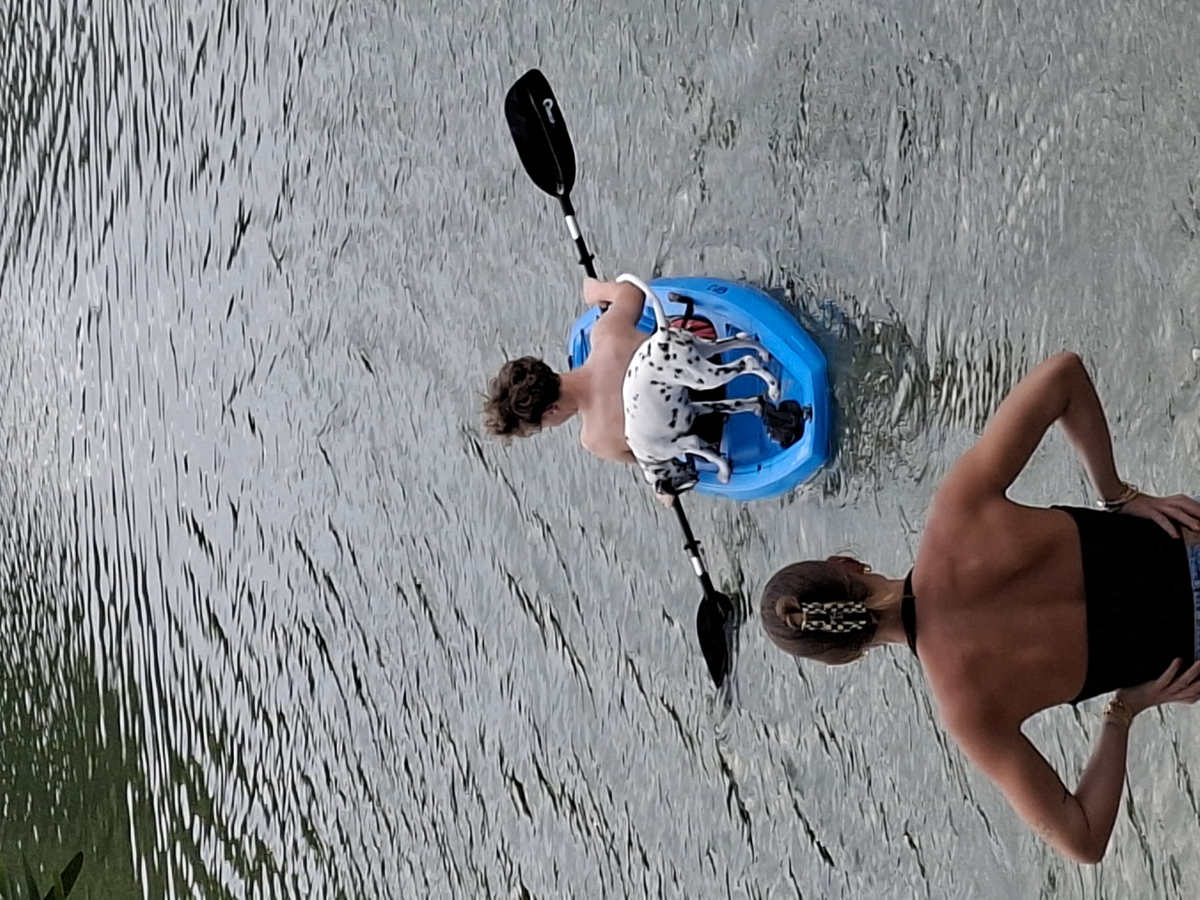 Jess and Peggy on the deck supervising Billy in a kayak and Lola at the water's edge |